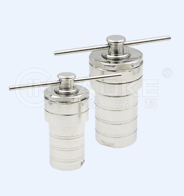 2、使用中:將溶劑和樣品加入四氟杯中,并保證加料系數(shù)小于百分之八十。蓋好壓緊(即使壓緊,四氟蓋子和四氟杯體接口處仍有約1mm的起密封作用的縫隙),再把四氟內(nèi)杯放到不銹鋼鋼套中(鋼套里面的鋼墊是小面朝下),兩片鋼墊配合蓋好,擰緊釜蓋,一般不必用鋼棒助力擰緊,普通男士手?jǐn)Q力已經(jīng)足夠。將裝好反應(yīng)物并擰緊的水熱釜放到烘箱中加熱,當(dāng)溫度達(dá)到100℃時,保持一小時,再升溫到所需溫度,保持兩小時。加熱溫度不能超過200℃;